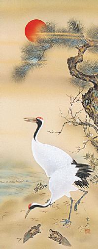 丹頂鶴は一生添い遂げる夫婦円満の象徴、旭日、亀、松竹梅。貴家のさらなる飛躍発展を祈る、新春はじめあらゆる慶祝の席を演出する名幅です。