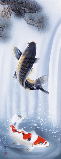 掛け軸(掛軸)販売通販なら掛け軸総本家 > 用途から選ぶ > 祝儀掛け > 夫婦滝昇鯉 唐沢碧山(草夕会) 尺三幅!